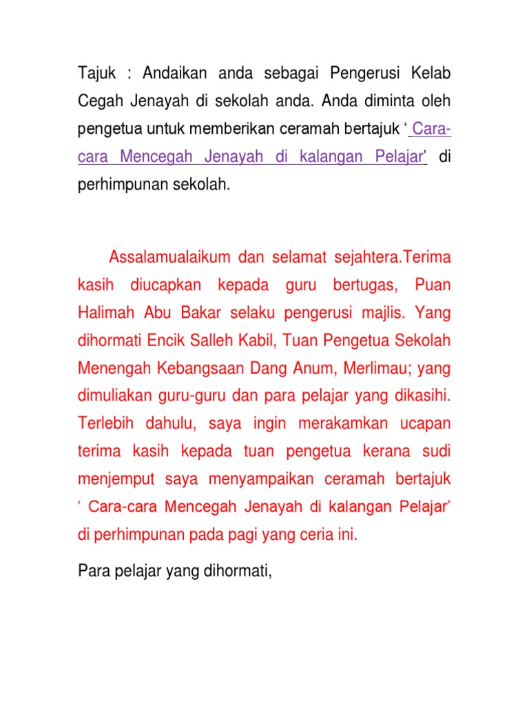 Kepentingan Amalan Berbudi Bahasa 3. Contoh teks pengucapan awam dalam bentuk ceramah teks ucapan vip majlis graduasi smk shah alam 2018 buku pages 1 5 text version anyflip doc. Cegah jenayah di sekolah anda.
